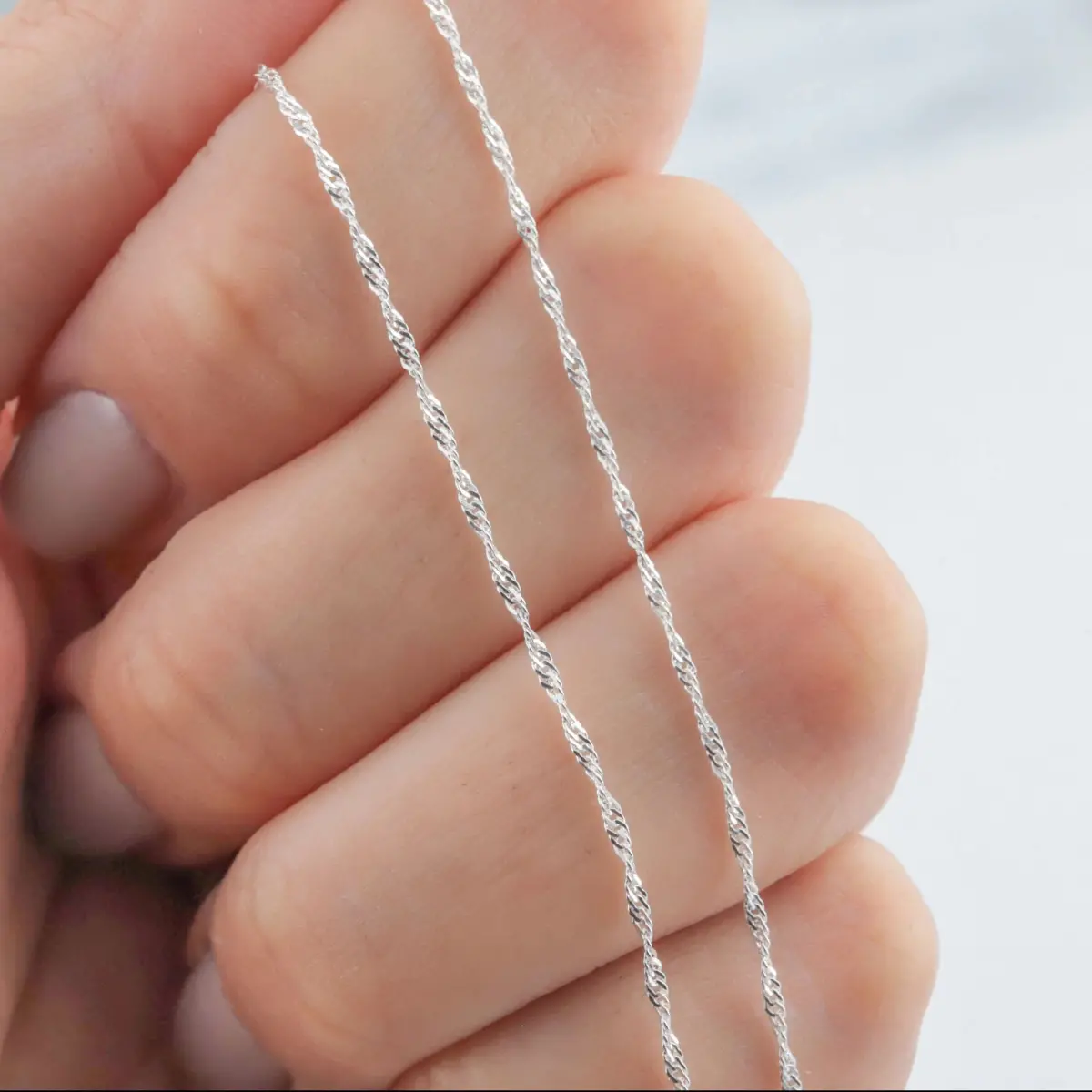 Esta cadena de plata 925 tipo Singapur destaca por su diseño entrelazado que refleja la luz en cada giro, creando un efecto de brillo dinámico y elegante. Perfecta para usar sola o acompañar con colgantes, es el accesorio ideal para sumar sofisticación a cualquier outfit.