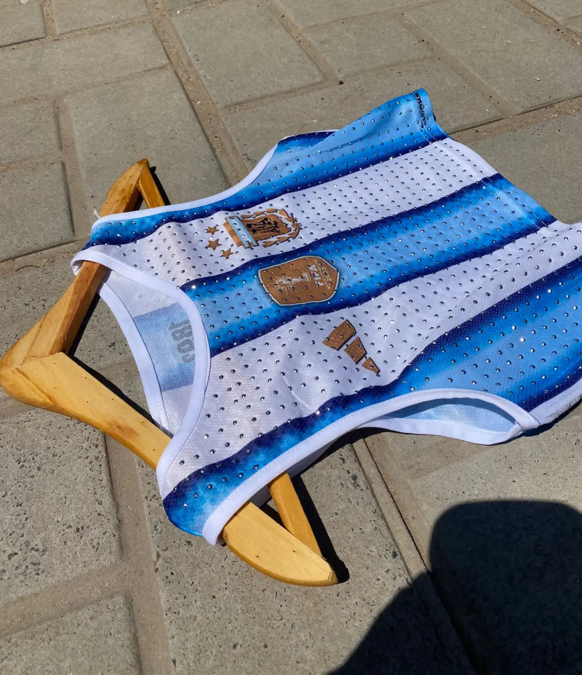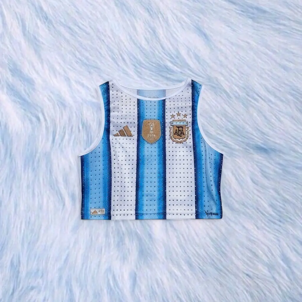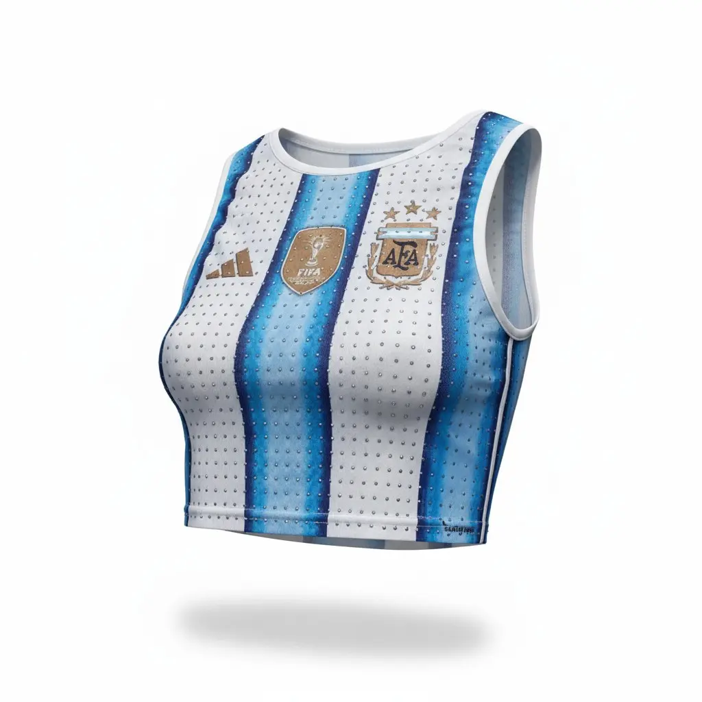 Esta musculosa femenina estilo Selección Argentina está pensada para vivir cada partido con actitud y brillo propio.