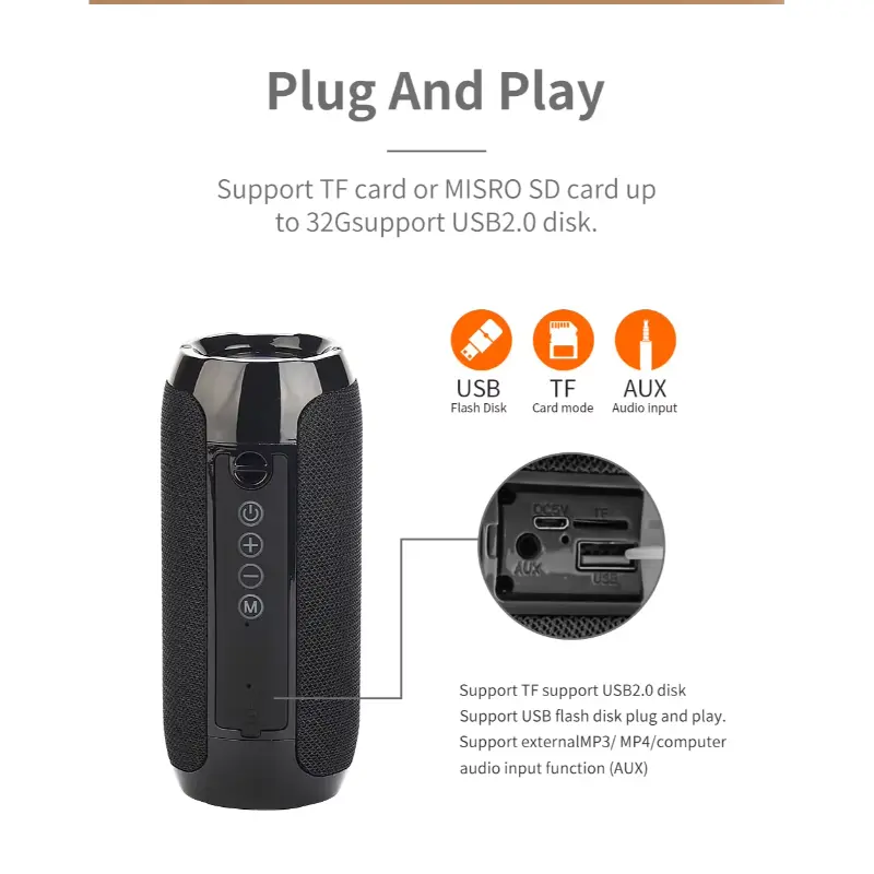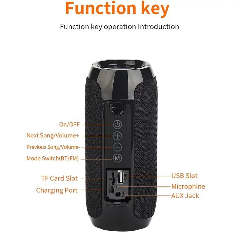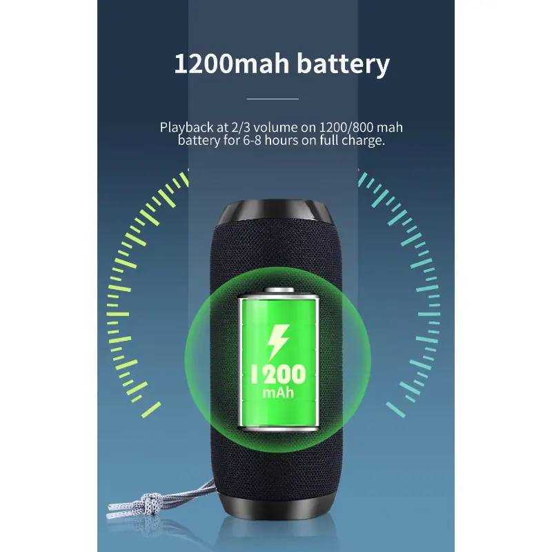 Sonido 3D con bajos profundos, Bluetooth 5.0 y autonomía de hasta 8 horas. Con certificación IPX5, es resistente al agua, polvo y golpes, perfecto para usar en casa, al aire libre o mientras viajás. Compacto, moderno y con múltiples conexiones: USB, AUX, FM y tarjeta TF. Un parlante listo para acompañarte a todos lados.